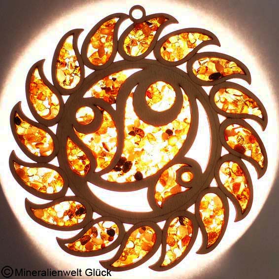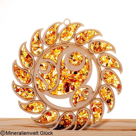 Bernstein Sonnensymbol mit Birkenholz, die neuartigen Energiesymbole aus unserem Sortiment.